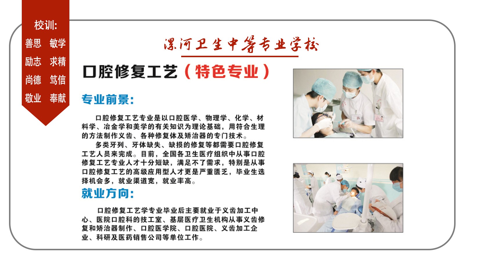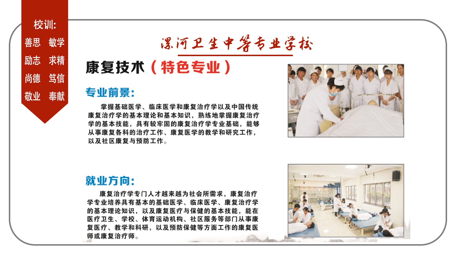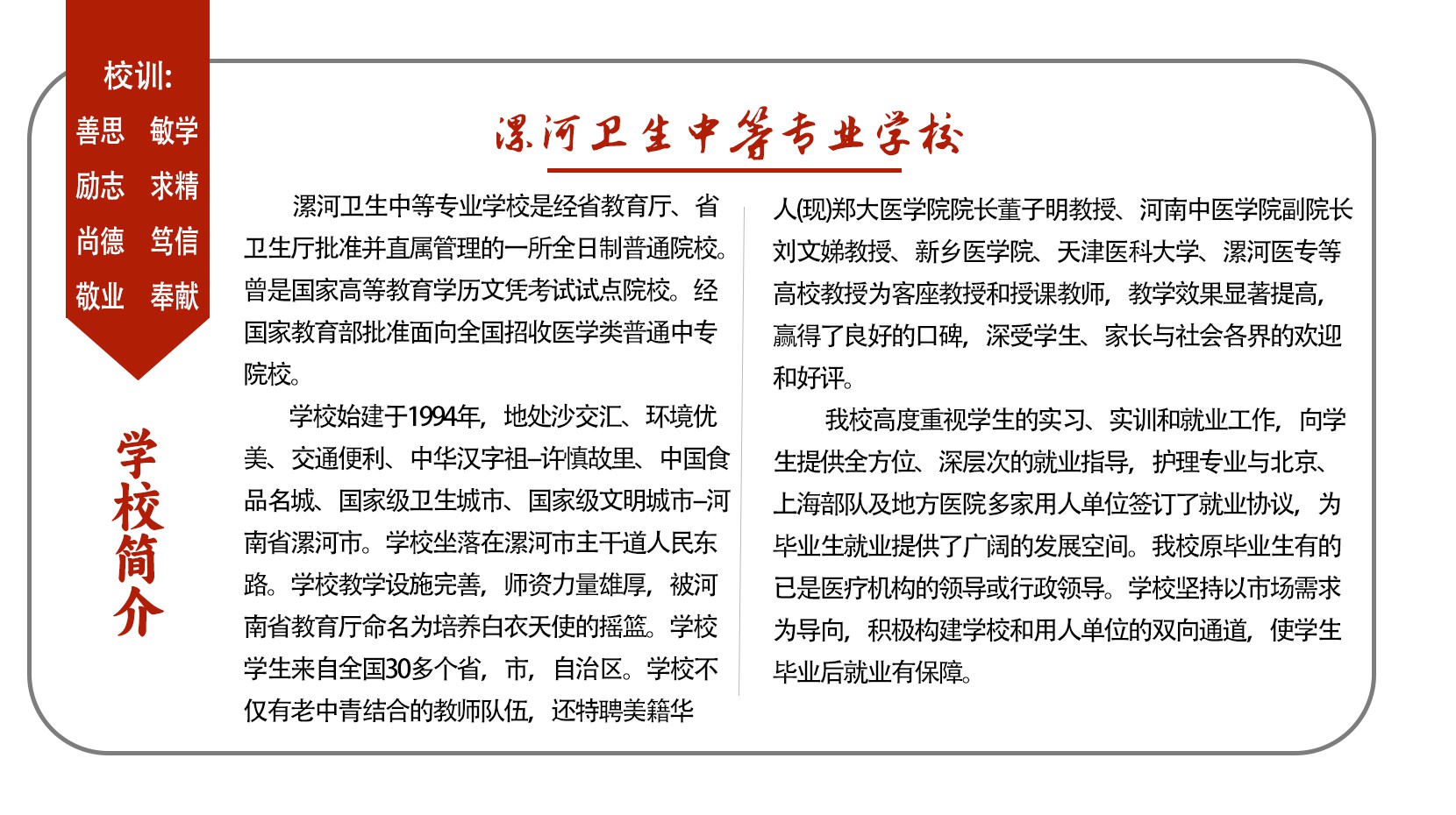 漯河卫生中等专业学校是经河南省教育厅、省卫健委批准的一所全日制普通院校。曾经国家教育部批准面向全国招收医学类的普通中等专业学校。 漯河卫校始建于1994年,地处沙灃交汇、环境优美、中华汉字鼻祖——许慎故里、中国食品名城、国家级卫生城市——河南省漯河市。三条高速公路,两条铁路,两条河流穿市而过,交通十分便利。学校坐落在漯河市主干道人民东路。